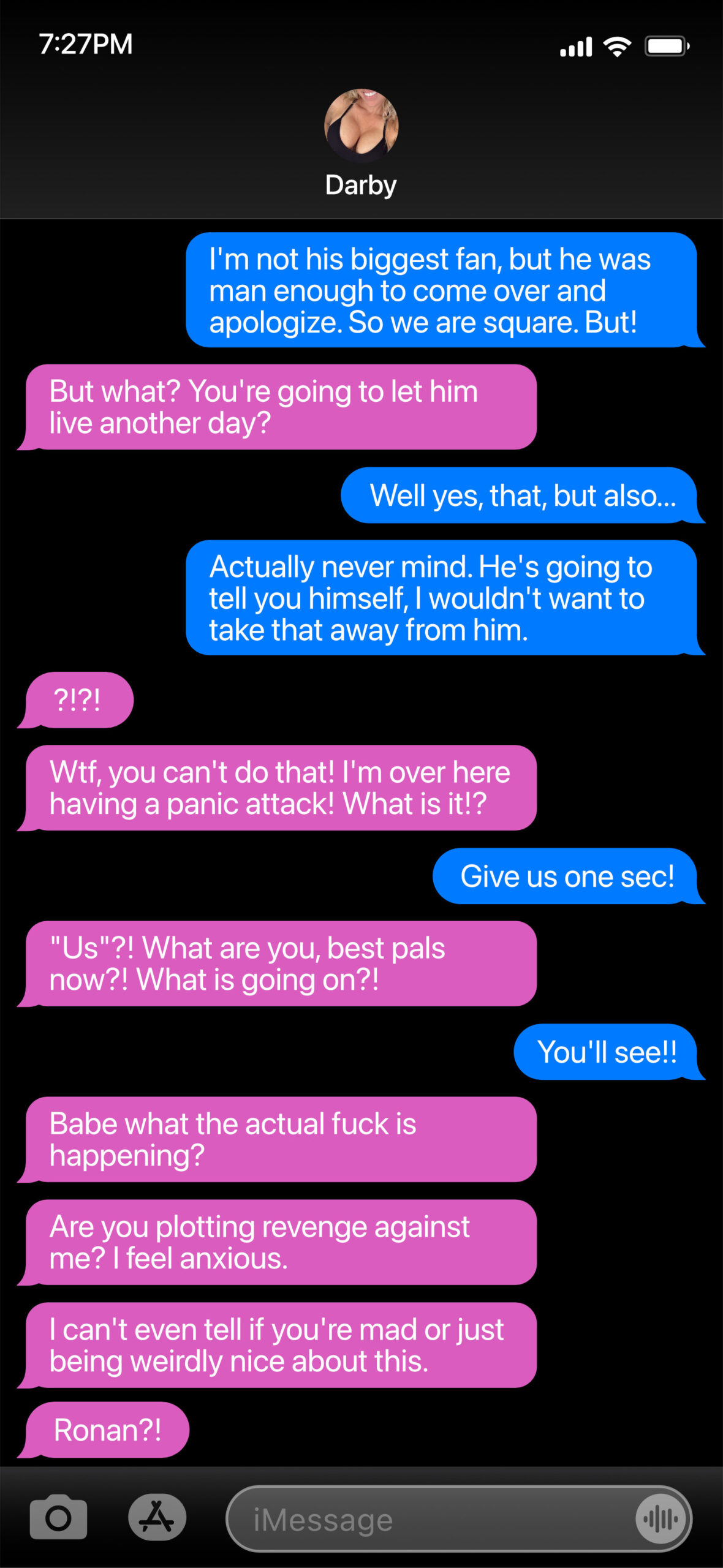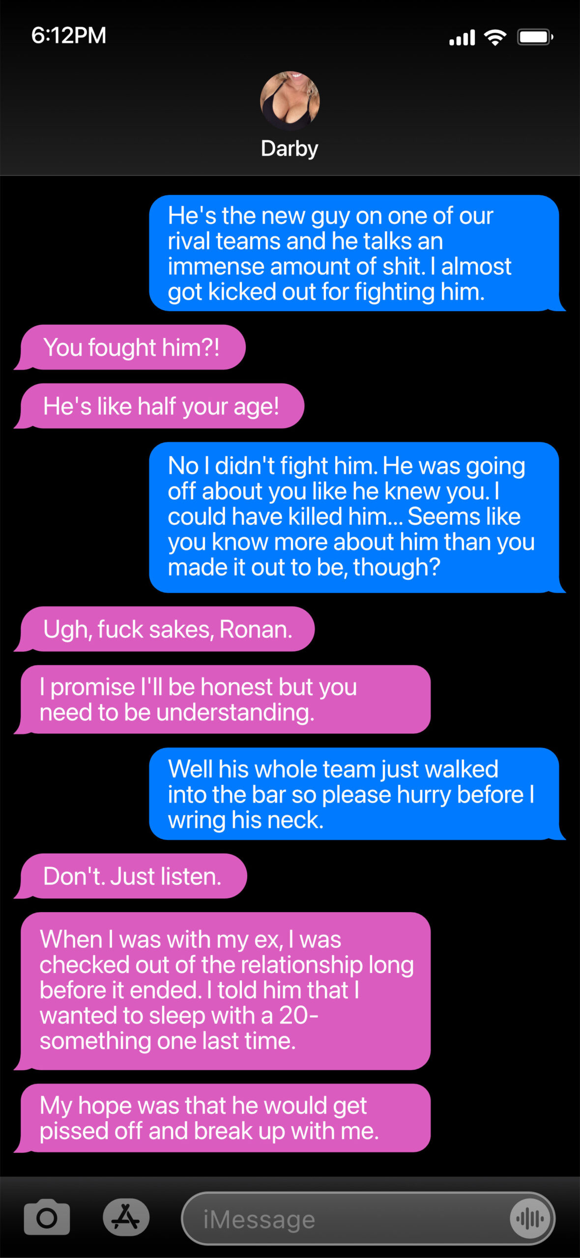 After a battle of words on the baseball diamond, Ronan gets into a fight with another heavy-hitter with a sexual history that is too close to home. After some more words shared over a beer, they come to an arrangement to settle their score.